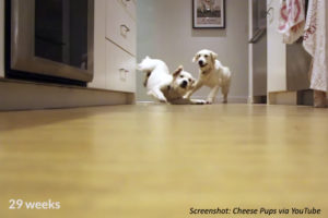 Dogs love food, especially these two golden retriever pups. Their owner filmed them racing to dinner every few weeks. The result is a cool time