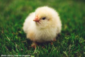 Peanut the chicken was a scrawny chick, like the one in the photo, when she was born – in fact, she couldn’t chip out of