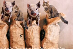 The saying “let the cat out of the bag” actually has to do with cats and pigs. And this cat-and-pig duo shows that there doesn’t