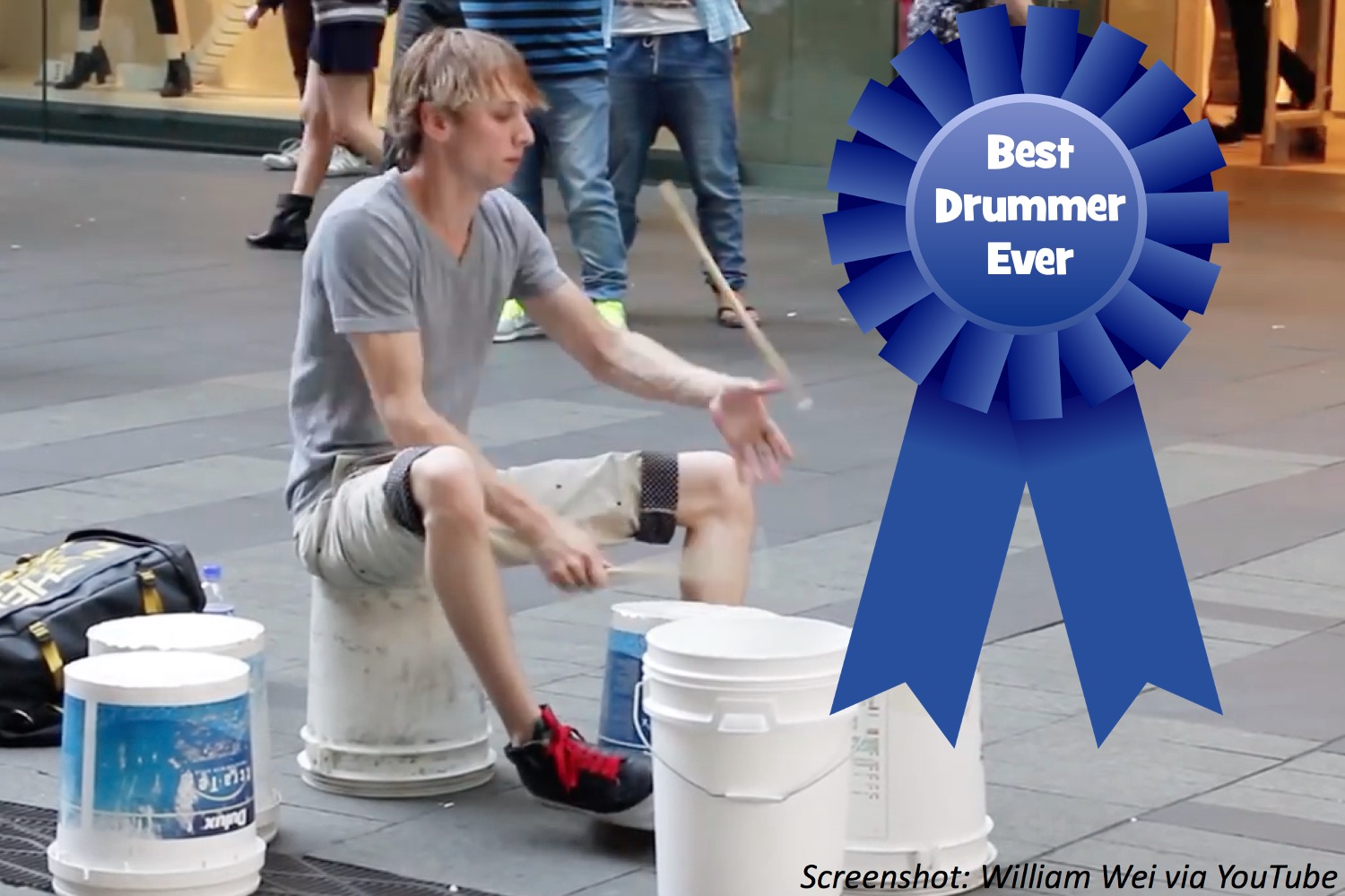We humans have been banging drums ever since we lived in caves. But once in a while a new drummer is so amazing that we’re in awe. As this video shows, this guy plays on plastic buckets, but makes incredible music. His right hand mostly plays speedy eighth notes, while his left hand plays all kinds of crazy rhythms. As he plays he makes faster and wilder beats, then twirls the sticks WHILE playing. If you do the math, the beats add up fast!
