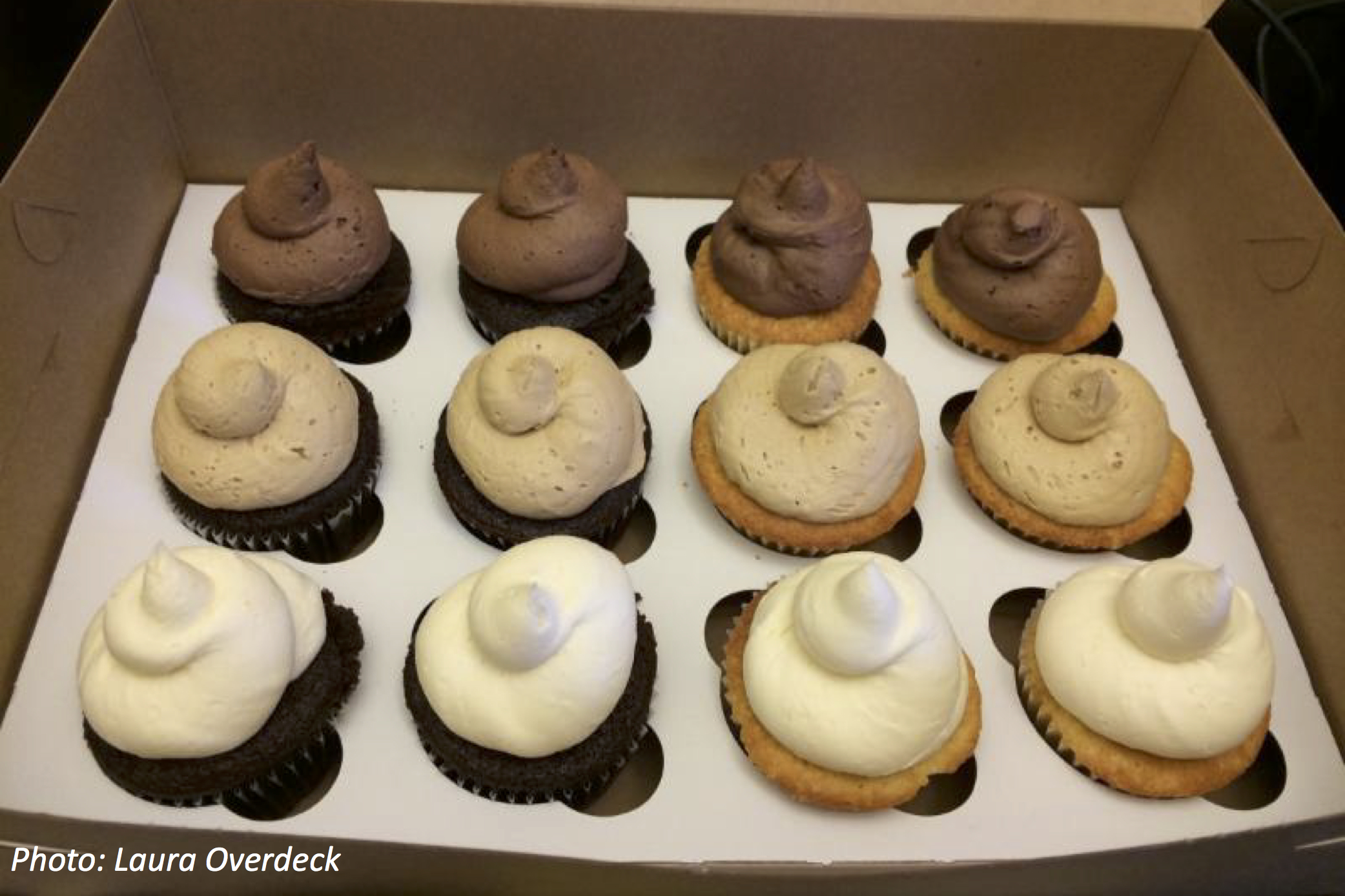 Do you know what a number cake is? That's what cupcakes were called in the 1800s. The first recipes called for 1 cup of butter, 2 cups of sugar, 3 cups of flour, 4 eggs...okay, and 1 cup of milk and 1 spoonful of baking soda. We love this set of cupcakes here because it puts each type of frosting (chocolate, coffee, and vanilla) on top of each cake flavor (chocolate and yellow). Of course, people like some frosting flavors more than others...so you have to do the math to see if you'll get your favorite.