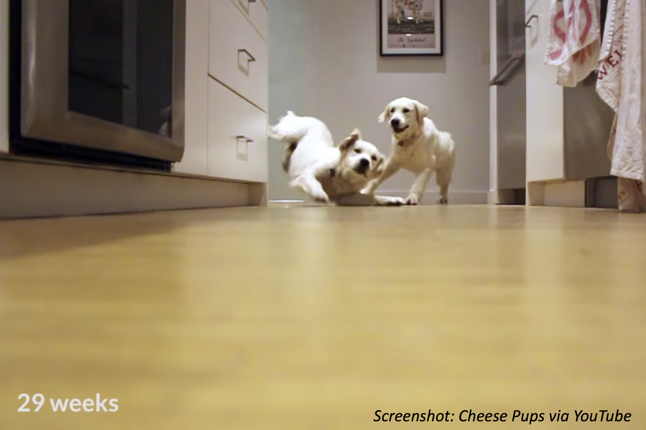 You’ve got to love this video of puppies skidding down the hall towards their food bowls. The 2 golden retrievers run down the same hall over and over — except they’re shown doing this about every 3 weeks. So through the video we see the puppies grow, and get a little better at rounding the corner without crashing. Somehow, they make it to dinner.