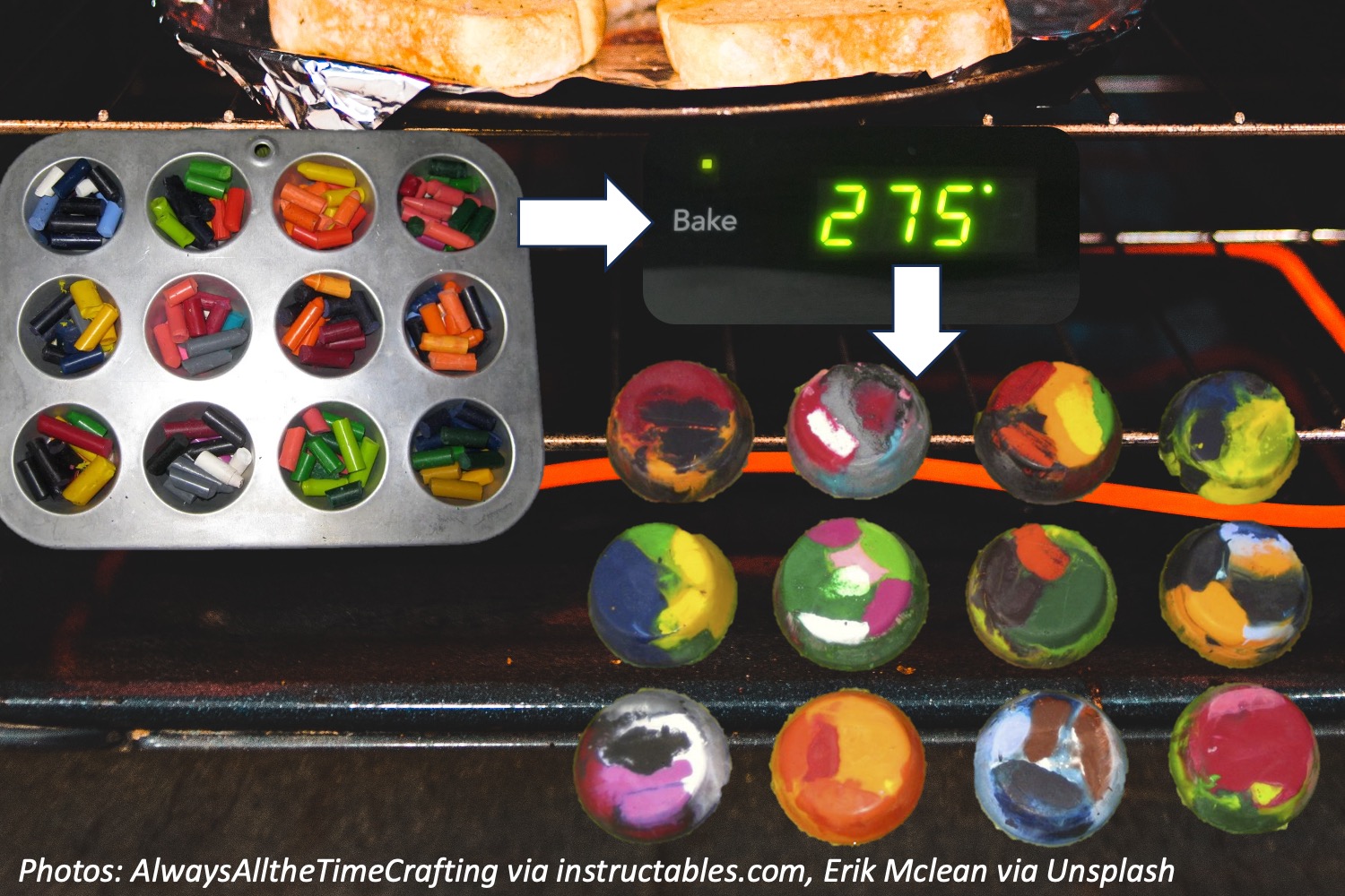 Little kids: What colors do you see in the tie-dye crayon in the bottom right corner? Point to it! Bonus: If you use 3 new colors in each tin, how many colors will 3 muffin crayons use?