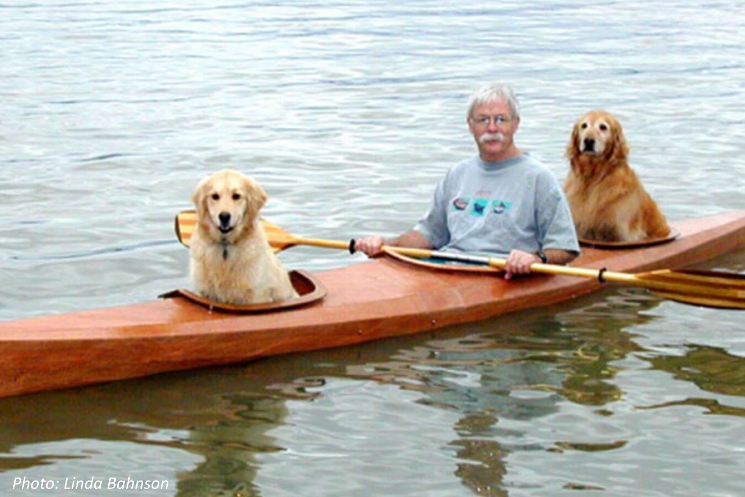 Dogs love to swim. We even call it the “doggie paddle” when we paw at the water with our arms. Canoe fan David Bahnson knew his dogs felt left out when he’d row away in his canoe. So he cut out seats for them, and now they come with him! They are Golden Retrievers, who weigh around 60-70 pounds each, plus David is in there…if they brought a bag of dog food, could that boat still float?