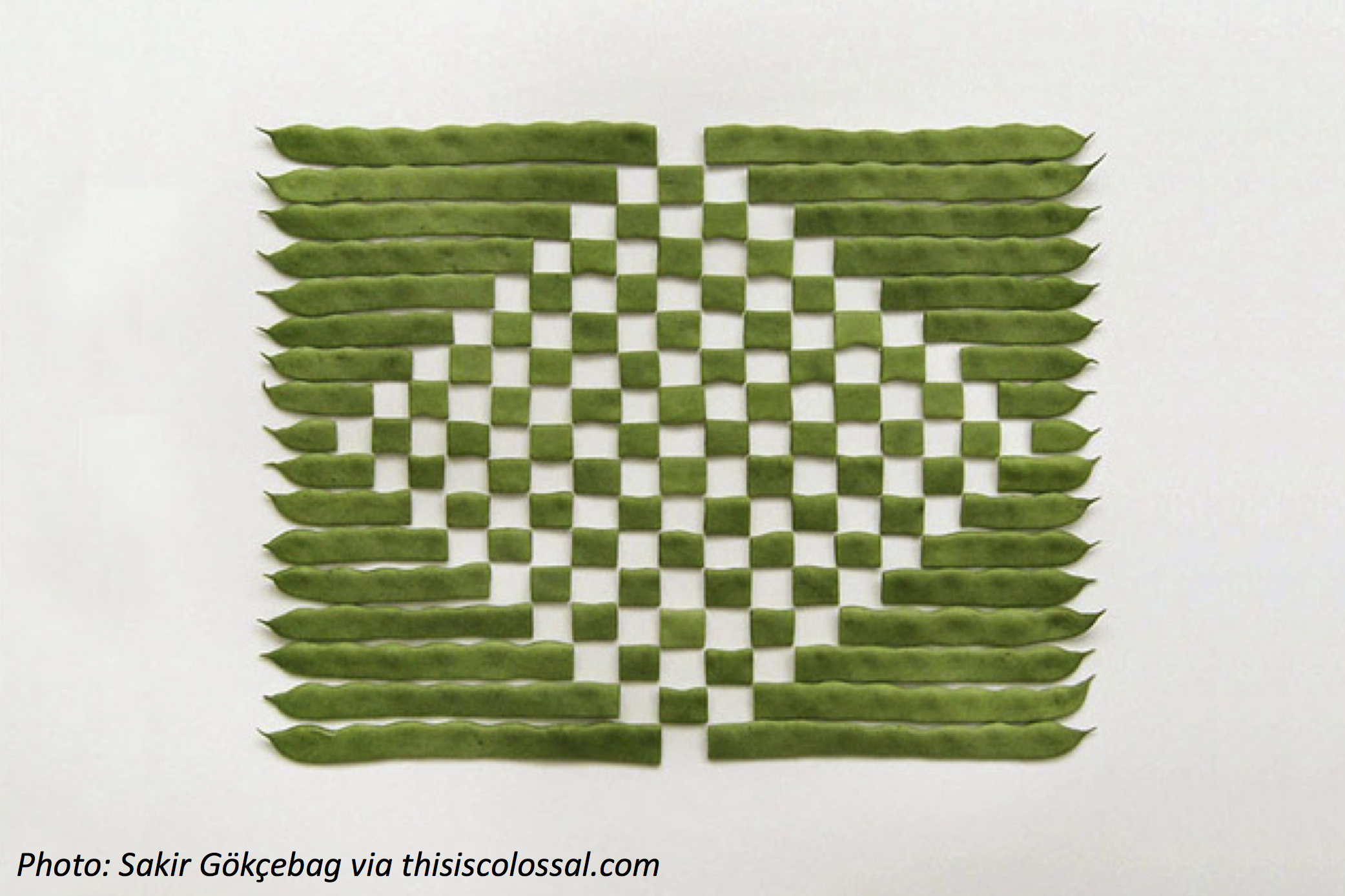 Little kids: How many rows of pea pods can you count?  Bonus: If the 1st row has 1 square shape (white), the 2nd has 3 square shapes, the 3rd has 5 squares…how many in the 4th and 5th rows together?