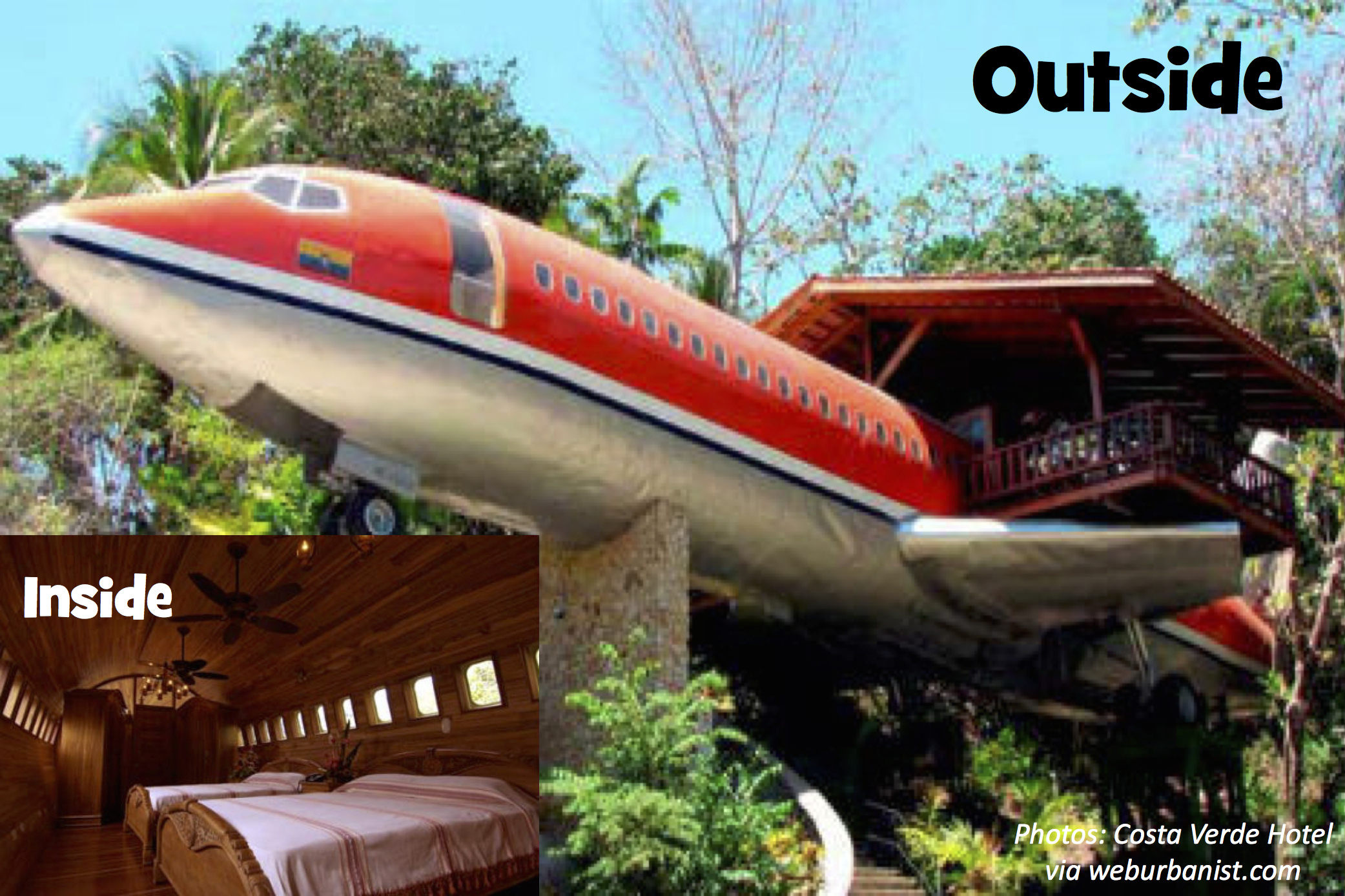 Have you ever flown in an airplane? Now how about living inside one? This hotel in Costa Rica turned the inside of an old plane into two nice wood-lined bedrooms, then stuck the whole plane on top of a 50-foot pole. That way visitors feel like they’re flying. Some other people turned a 727 into a 3-bedroom home; it sticks out over a lake as if it’s taking off. But don’t worry if you get airsick: as this webpage shows, people have turned ships, trains and even buses into very cool homes for themselves. When it comes to your dream house, it’s whatever floats your boat.
