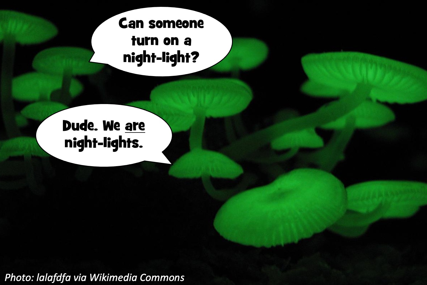 Little kids: How many glowing mushrooms can you count in this awesome photo? Count as high as you can! Bonus: If the mushrooms start glowing on Tuesday at noon and glow for exactly 3 days, on what day do they stop glowing?