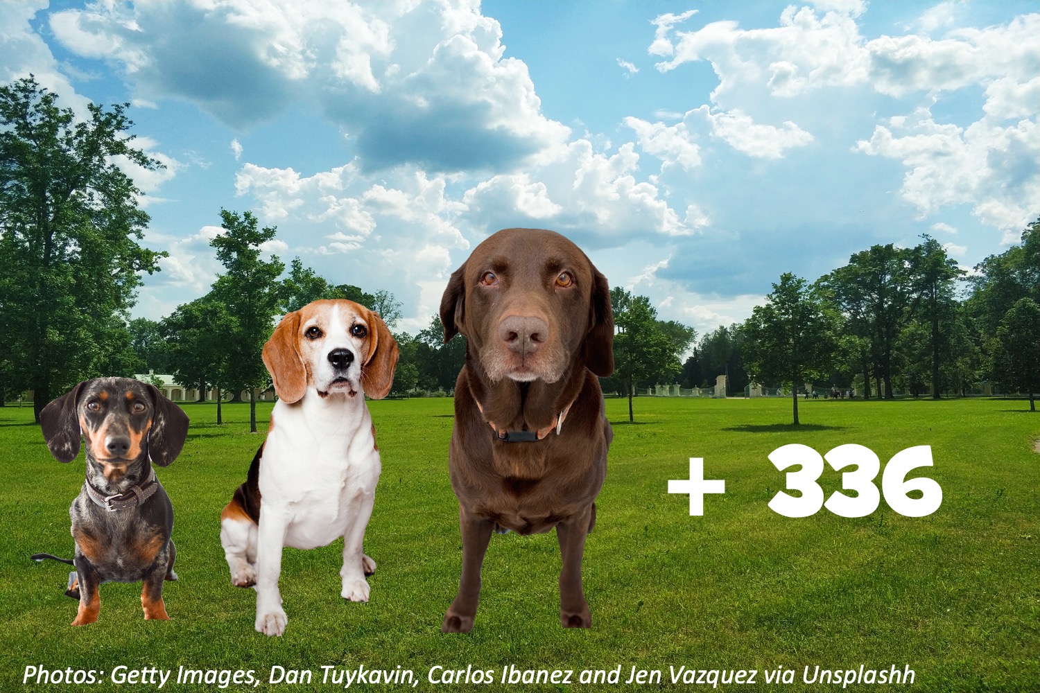 Big kids: There are 339 breeds in 10 groups. If those groups were equal, about how many dog breeds would you have in each? Bonus: If you have 22 retrievers, and half are standing on their hind legs while the rest are standing on all 4 legs, how many paws are on the ground?
