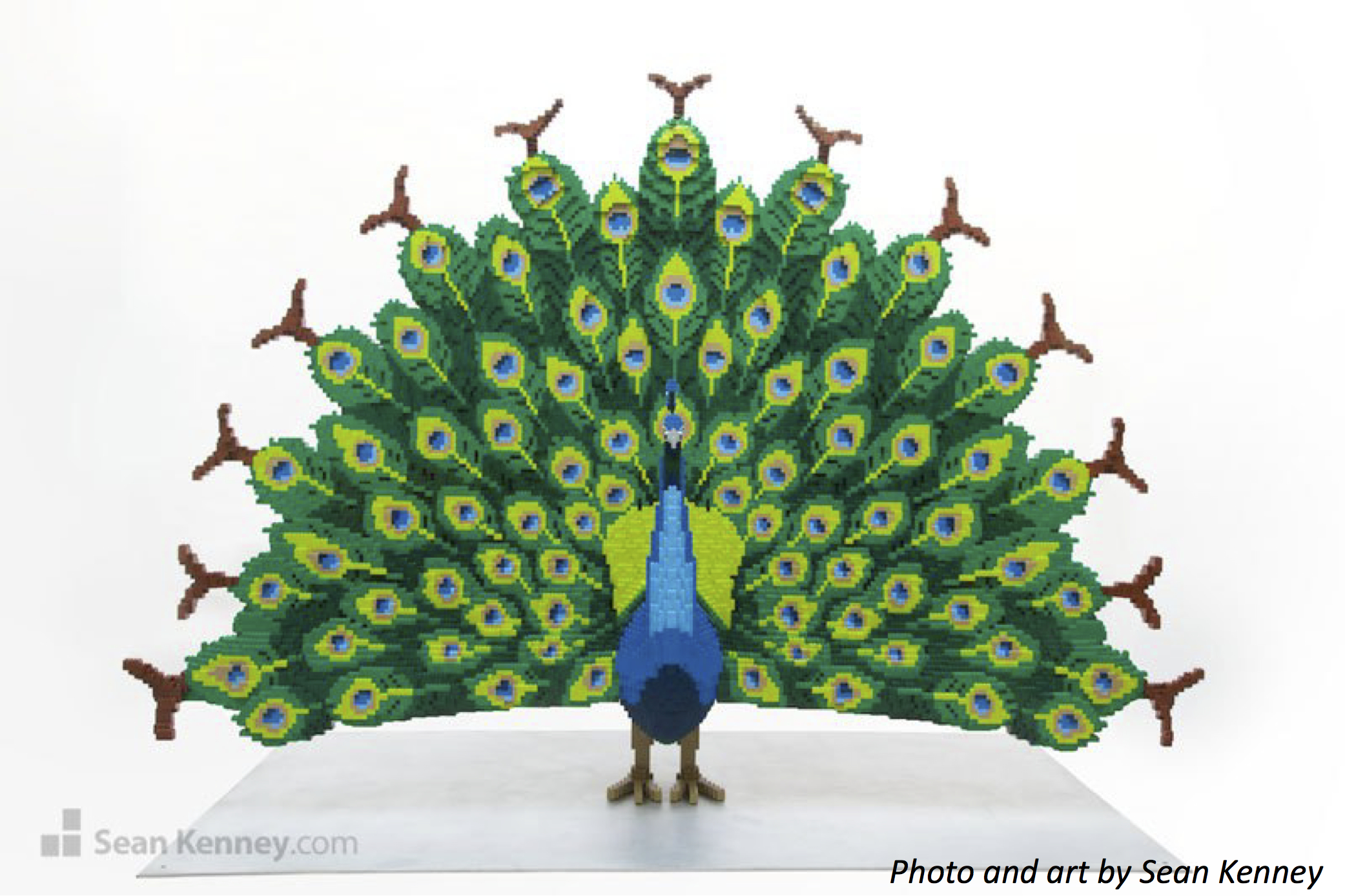 Little kids: The peacock tail uses 3 shades of blue, 4 shades of green, a grey and a brown. How many colors is that? Bonus: If you stack a blue brick, then a green, a grey, and a brown, then start over with blue to repeat, what color is the 13th piece?