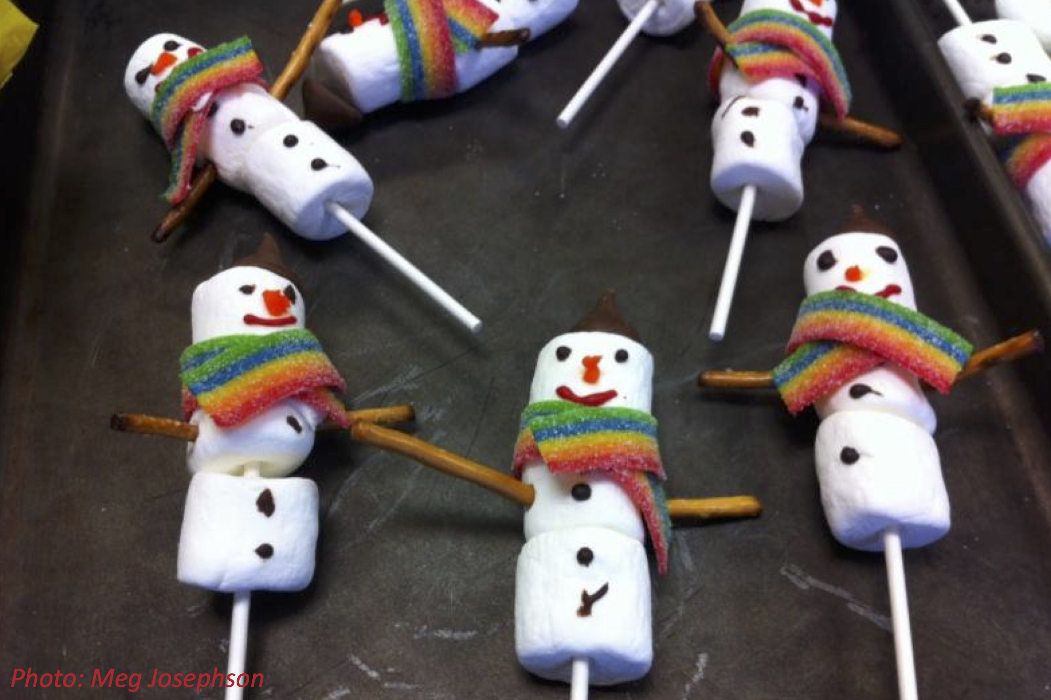 If you haven’t seen any snow this year, you can still make a cute snowman. These snowmen on sticks from our fan Meg J. have marshmallows for their 3-snowball bodies, pretzels for arms, Hershey kiss hats, and stripey rolled-fruit scarves. Dots of frosting make the buttons and the happy face. Compared to the real thing, these are a lot less cold and wet, and a lot yummier.
