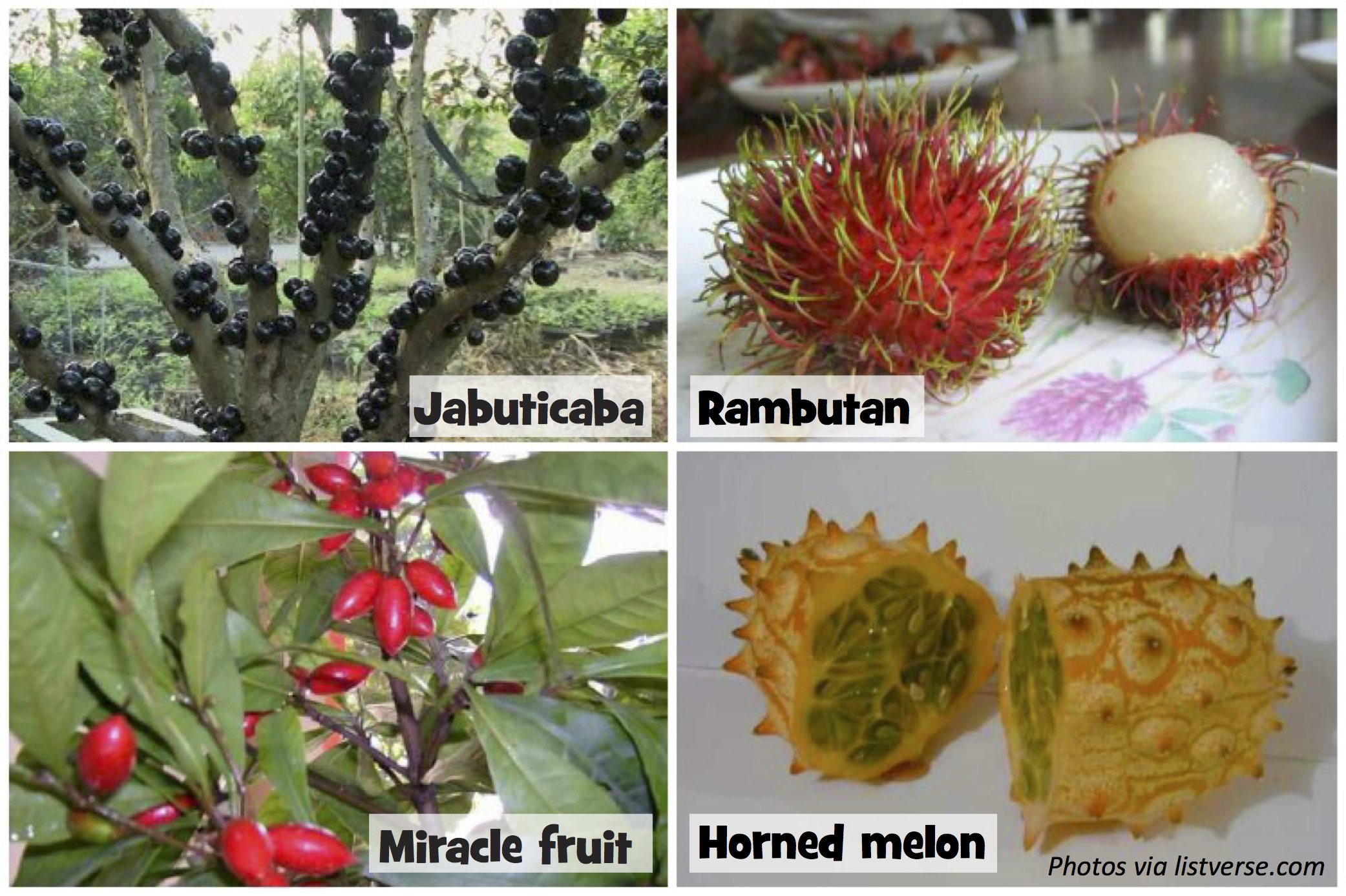 Sure, you’ve probably eaten apples, bananas, and grapes. But have you ever tasted any of the fruit you see in the picture? That grape-like jabuticaba grows right on the trunk and branches of the tree. The rambutan looks like a furry strawberry, and the horned melon really has horns. And when you eat the berry-like miracle fruit, everything you eat after it tastes sweet, even broccoli. If you don’t love your veggies, that might be a great weird fruit for you.