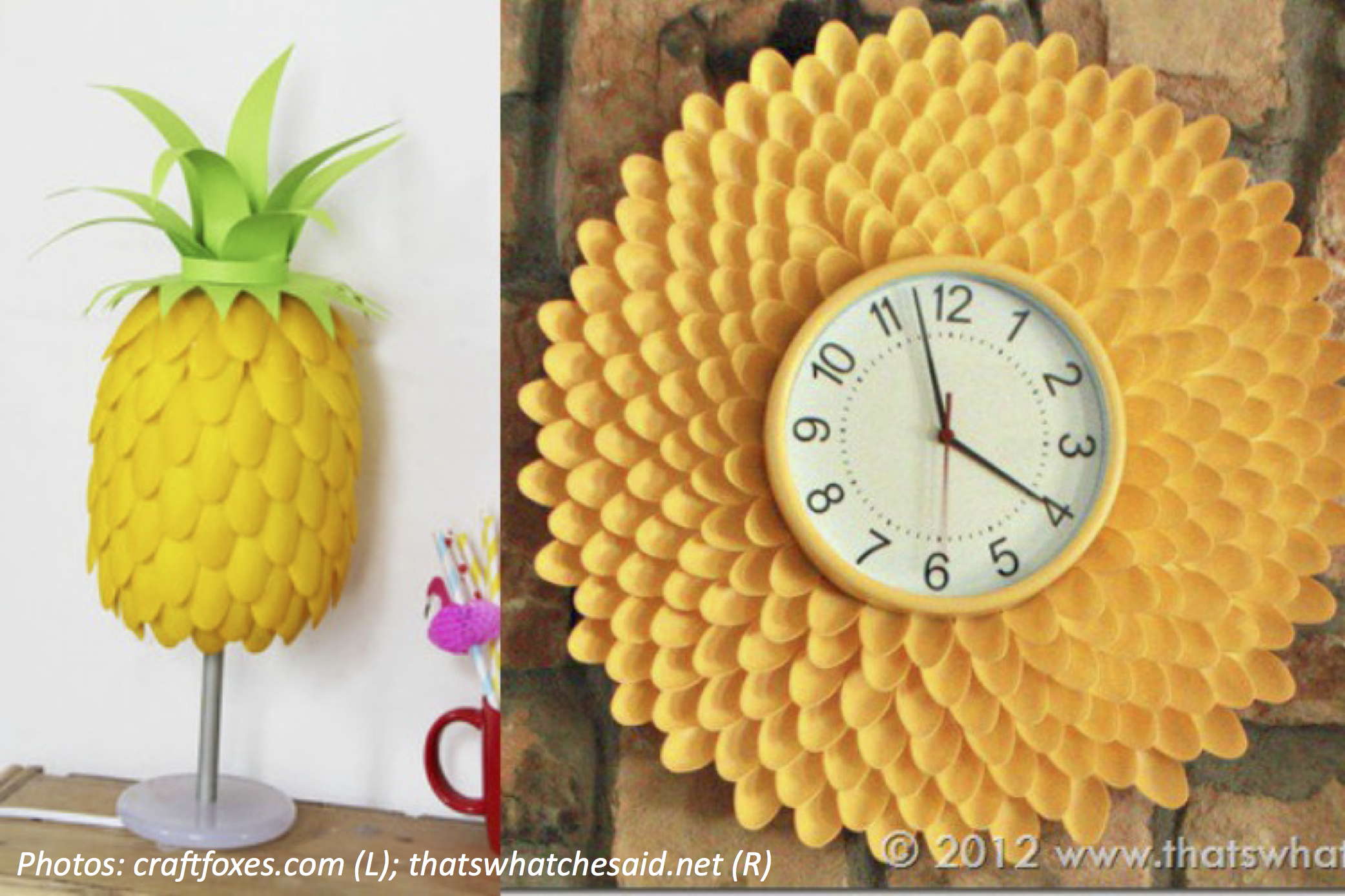 When you see what cool things people can make out of plain old plastic spoons, you might never throw out a spoon again. On one site, an artist used the scoop parts of 125 plastic spoons to make a lamp that looks like a pineapple. On another page, someone else glued together 250 spoon scoops to make an 18-inch-wide flower face around a clock. Now we can decorate our houses while saving some trash from the dump, too.