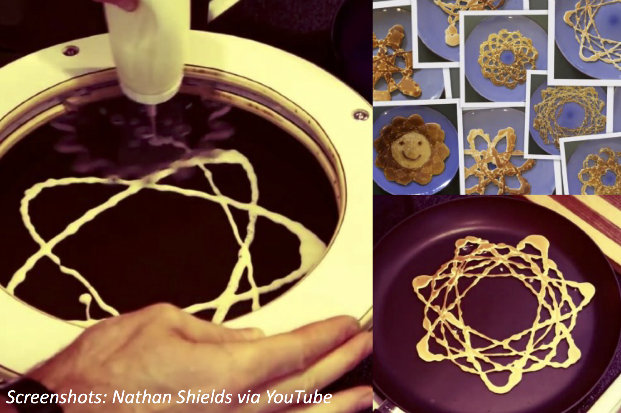 Pancakes are even yummier when they have crazy designs. These folks made a tool that spins out pancake batter the same way as one of our favorite toys, Spirograph. In Spirograph, you stick your pencil into a hole in a flat wheel with teeth (a “gear”); as you turn the gear inside a bigger ring, your pencil draws really cool, spirally shapes. The “Pangraph” pancake gadget pours the batter in the same loopy lines…and then you get to eat your art!