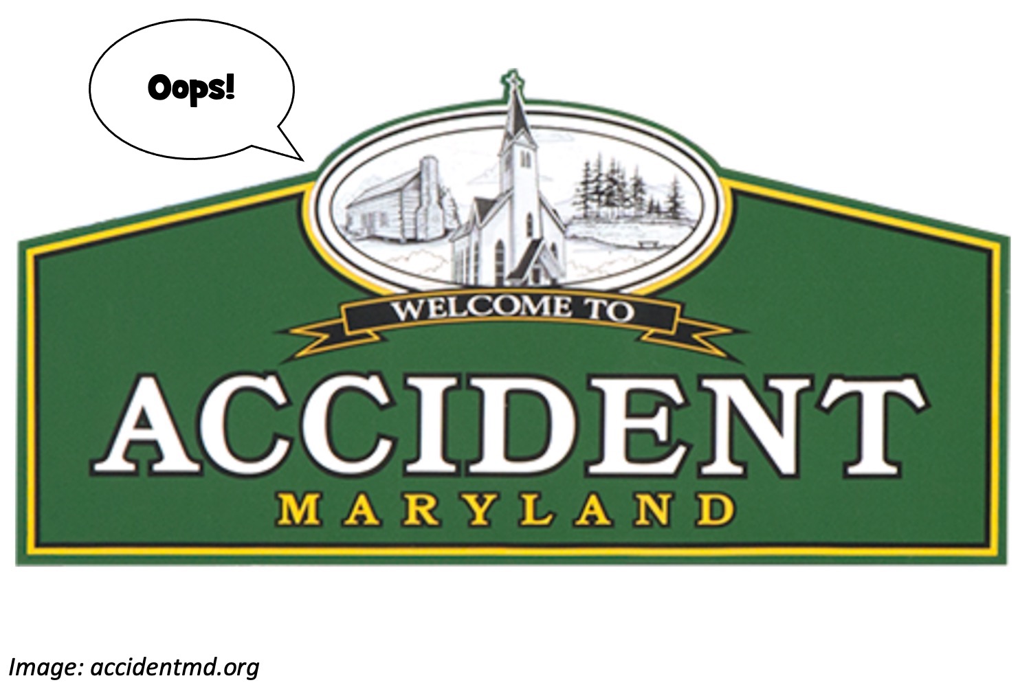 We love hearing about towns with silly names, and our fan Scott S. just told us about one we didn’t know: Accident, Maryland. How did it get its name? Apparently back in 1774, Lord Baltimore told people they could move onto his land in western Maryland. Two guys named William Deakins and Brook Beall started marking off the space they wanted — only to find out that they’d grabbed the same land “by accident.” They were buddies, so Deakins let Beall take the land. But it also turned out to be only 682 acres, not the 778 that Beall was supposed to get – so there was a math accident in there, too!