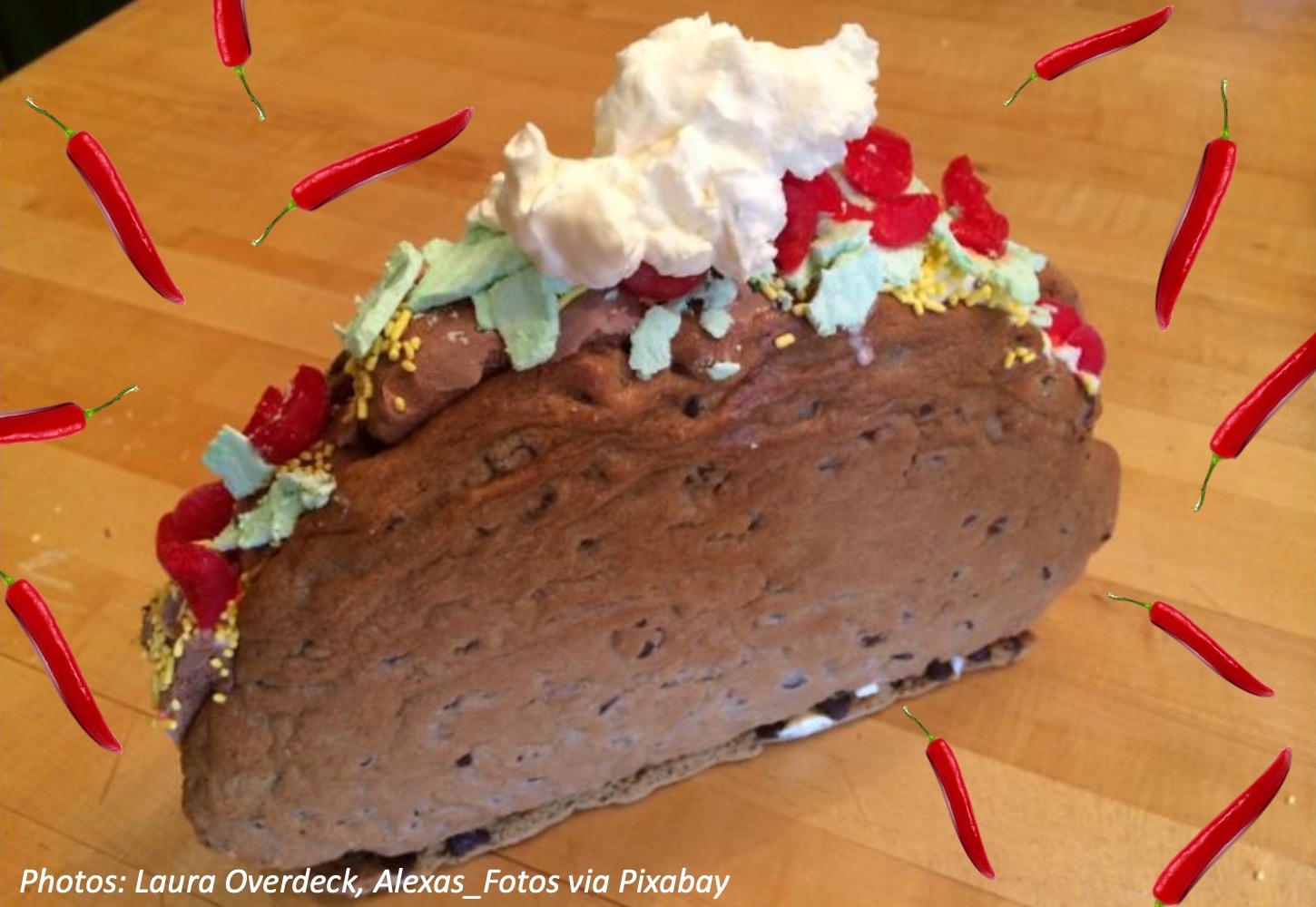 Big kids: If the Taco Tuesday cake is 5 regular tacos long, 3 tacos wide and 2 tacos tall, how many regular tacos could you fit inside this one? (Hint of needed: What if it was the same height, but still 5 tacos long and 3 tacos wide? And don’t worry about edges lining up.)  Bonus: If the taco cake uses 14 times as much topping as a regular taco, how many teaspoons of sprinkles were needed if a real taco uses 4 teaspoons?