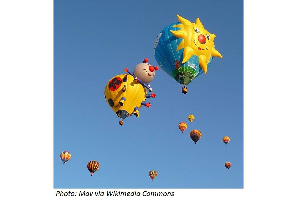 What’s that funny-looking bug, and that big smiley sun? They’re hot air balloons flying in the Albuquerque International Balloon Fiesta, which starts today! Hundreds of hot air balloons fly each day, including crazy ones shaped like chickens, cows and trains. The hot air balloon is a pretty simple idea invented in 1783 in France. A flame in the basket at the bottom heats the air in the balloon. So that air weighs less than the sky air around it, which makes the balloon float up. Thanks to that trick, now any animal can fly.